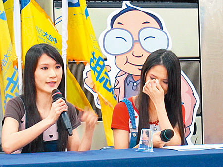 雙胞胎姐妹陳珮瑜(左)、陳珮涵,為挺胡志強自拍音樂影片,慘遭惡搞影射成酒店小姐,淚灑記者會場。