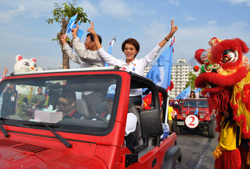 高雄市長選戰12日起跑,國民黨高雄市長候選人黃昭順(右)車隊由競選總部出發,游街造勢。 圖片來源:“中央社”