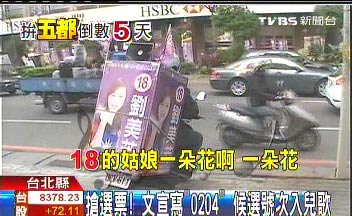 據臺灣TVBS報道,臺灣“五都”選舉進入倒數計時,候選人紛紛出奇招,開著宣傳車穿梭大街小巷,賣力向選民宣傳,有人把候選號碼結合耳熟能詳兒歌。