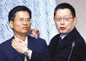 “立法院內(nèi)政委員會(huì)”昨天聽取“1126槍擊案”項(xiàng)目報(bào)告,“警政署長”王卓鈞(右)、“法務(wù)部檢察司副司長”林錦村(左)分飾槍手林正偉與被害人連勝文,還原槍擊案發(fā)生當(dāng)時(shí)狀況。圖片來源:臺(tái)灣《聯(lián)合報(bào)》