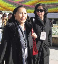 孫中山的孫女孫穗芬(左)受老友之邀赴臺參觀花博,72歲的她,保養得宜,神采煥發,隨身的友人則刻意低調,不時打探周邊人群動靜。圖片來源:臺灣《聯合報》