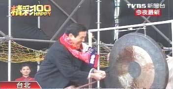 昨(1)日是元旦,為表慶祝,馬英九下午大筆一揮,當眾揮毫漢字;寫完毛筆,馬英九架勢十足的欲敲吉祥鑼鼓,還蹲馬步用力一敲,未料用力過猛將鼓棒敲“飛”,惹得現場人員大笑不止。隨扈見此連忙將鼓棒撿回,馬英九則重敲鑼鼓。