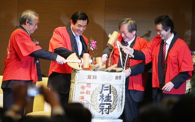 據臺灣“中央社”6日的報道,馬英九6日晚間出席2011年臺北日本人會、臺北市日本工商會新年會,除了致詞外,也參加日本“開鏡”儀式。馬英九身穿日本傳統紅色服裝,與日本人士以木槌打擊清酒桶,并和現場來賓舉杯共祝新年愉快。