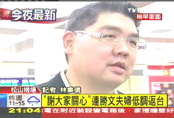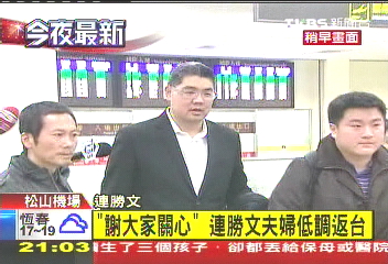 連勝文11月26日晚助選國民黨新北市議員參選人陳鴻源時遭槍擊,受傷后連勝文十分低調,只以戴口罩的面貌出現,日前到上海復診腎臟腫瘤,今晚返回臺灣時,卻未戴口罩,全臉曝光。