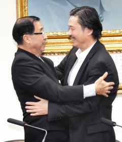 國(guó)民黨即將卸任秘書長(zhǎng)的金溥聰(右)和將接任黨秘書長(zhǎng)的廖了以(左),兩人在記者會(huì)擁抱兩次。圖片來(lái)源:臺(tái)灣聯(lián)合報(bào)