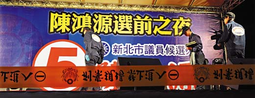連勝文在陳鴻源的造勢晚會站臺助選,被“馬面”林正偉朝頭部開槍,圖為案發后,警方封鎖現場采證。圖片來源:臺灣《聯合報》