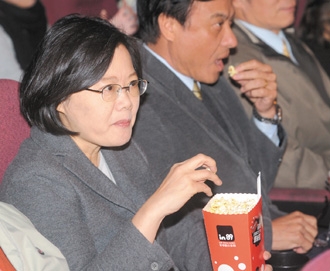 民進黨主席蔡英文(左)昨天觀看電影“雞排英雄”。對于呂秀蓮炮打黨中央,蔡英文說,已責成秘書長蘇嘉全(右)拜會呂,“主席個人的意見不是最關鍵的”。