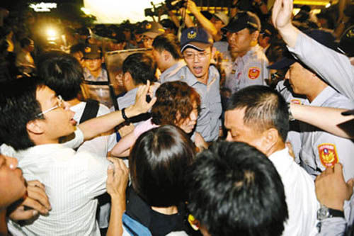 資料圖:2008年11月,陳云林赴臺,民進黨煽動綠營民眾鬧事數百人用石塊、棍棒攻擊警察,深夜還有人擲汽油彈形成火海。7日凌晨,鎮暴噴水車朝現場噴水柱強制驅離人群。這場流血事件,堪稱臺灣近十年來最嚴重的警民沖突。