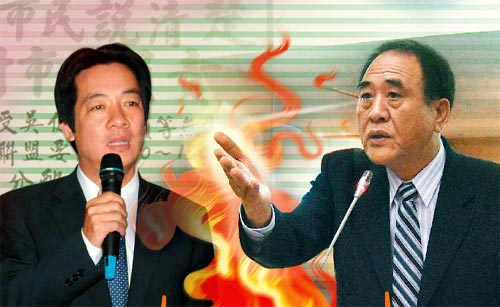 因建設工程款爭議,臺南市政府與議會對立。市長賴清德(左)表示議員要工程款,越權造成浪費。市議員吳健保(右)則表示,市長如此說法,無異是向議員開戰。圖片來源:臺灣《聯合報》