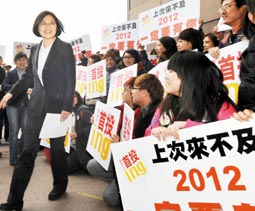 蘇貞昌前腳剛離開民進(jìn)黨中央黨部,蔡英文陣營馬上號召“首投族”會師喊口號。蔡英文表示,“首投族”一種是第一次投票的年輕人,一種是明年第一次投票給蔡英文的人。