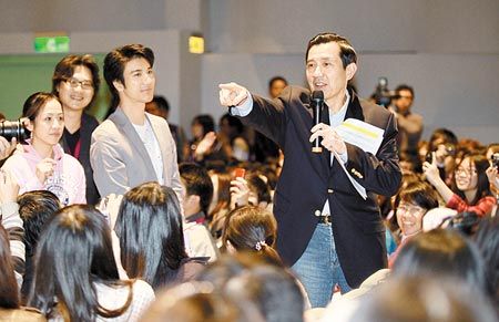 馬英九(右)與歌手王力宏(右二)29日在臺灣清華大學對談。結束后2人走到臺下與學生互動,引起熱烈回響。來源:臺灣《中國時報》