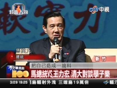 臺灣清華大學慶!鞍倌晷c”,3月29日邀請馬英九與臺灣偶像歌手王力宏以為題 “夢想造就軟實力”對談。據臺灣《今日新聞》報道,61歲的馬英九和35歲的王力宏都穿著西裝搭牛仔褲出席,主持人、前臺灣清華大學校長劉炯朗一度要求兩人唱歌,馬英九笑說,“在王力宏面前班門弄斧,不是要我老命嗎?”王力宏則說,“總統”應該不好當吧?后來王力宏清唱一段英文歌,才引導馬英九唱出一個字,博得全場熱烈掌聲。