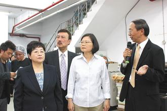 蔡英文(右二)昨天參訪社福機構時神情緊繃,她指出楊蕙如泄漏民調,自己也是受害者。