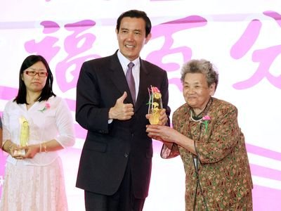 馬英九(中)8日出席在臺中市中僑花園飯店舉辦的“母愛100幸福百分百─母親節慶;顒印,頒獎表揚堅忍卓越的臺灣模范母親。圖片來源:臺灣“中央社”