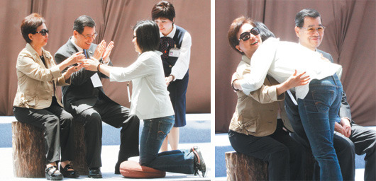 蕭萬長(中)與夫人朱俶賢(左)昨天上午與女兒蕭至佑,一同參加法鼓山“知福幸福—媽媽好幸福”感恩活動,蕭至佑跪著為媽媽奉上一杯茶水,感謝母親平日的辛勞,并給媽媽一個深深的擁抱(右圖)。來源:臺灣聯合報