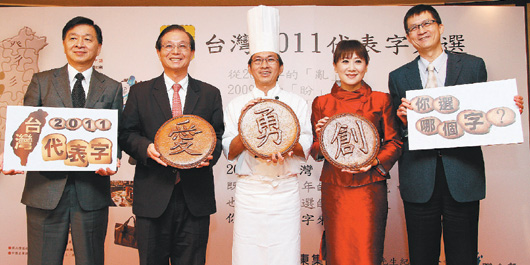 臺灣教育部門負責人吳清基(左二)、面點師吳寶春(中)及SOGO百貨董事長黃晴雯(右二)昨天在“臺灣2011代表字大選”公布候選字記者會中,手持印有“愛、勇、創”的烘焙面包,與徐元智先生紀念基金會執行長黃茂德(左)、《聯合報》總編輯羅國俊(右)為活動造勢。(圖片來源:臺灣《聯合報》)