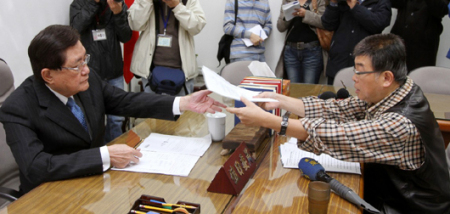 國民黨民代邱毅(右)上午遞交臺灣經(jīng)濟建設(shè)委員會公文復(fù)印件給臺當(dāng)局監(jiān)察主管部門值日監(jiān)察委員葉耀鵬(左),要求臺當(dāng)局監(jiān)察主管部門調(diào)查2012年臺灣地區(qū)領(lǐng)導(dǎo)人、民進黨候選人蔡英文、前臺灣經(jīng)濟建設(shè)委員會主任何美玥與前臺灣發(fā)展基金管理會副執(zhí)行秘書何俊輝。(圖片來源于:臺灣《聯(lián)合報》)
