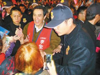昨晚,馬英九為國民黨民代參選人李全教、蘇俊賓、謝龍介站臺,他在永康區復華夜市提前下車,步行數百米,開心與支持者擊掌,女馬英九迷不時突破臺特勤人墻,一手拉馬的手不放,另一手拍照,隨行人員被迫不斷出手阻攔,直到馬英九進入會場。