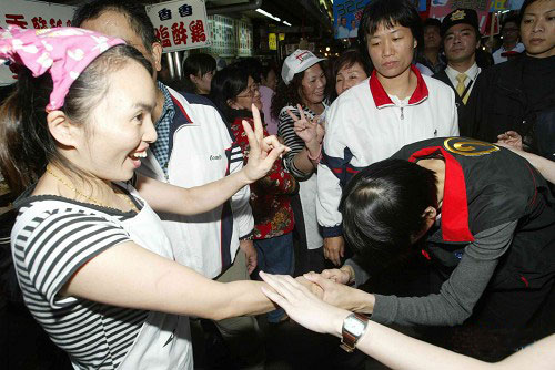 2008年周美青(彎腰者)赴基隆市廟口為馬英九拜票。資料照片