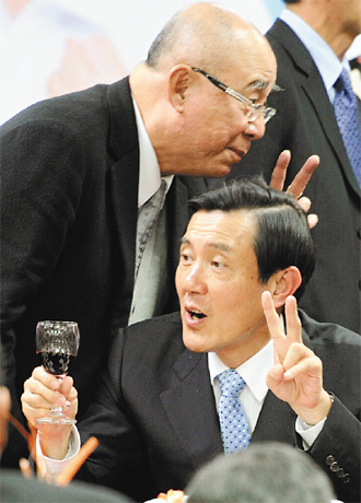國民黨中央黨部昨晚舉行尾牙,國民黨主席馬英九(前)和吳伯雄(后)敬酒時,不忘比出二號手勢。