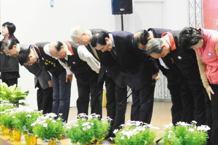 中國臺灣網2月13日消息 據臺灣《聯合報》報道,正、副臺灣地區領導人馬英九、吳敦義昨到臺中謝票,地方干部大排長龍,爭相合影。主持人宣布馬英九團體鞠躬表達感謝,但因彎腰時間太短,遭到馬英九糾正。馬英九稱,鞠躬不能少于10秒鐘,隨即帶領眾人重新深深鞠躬,表達誠摯謝意。(中國臺灣網 李迪)