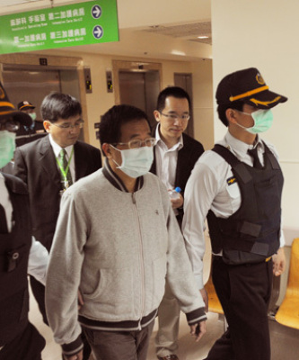 陳水扁(左二)清晨在法警戒護(hù)下,前往桃園醫(yī)院接受健康檢查,陳水扁未戴戒具,由兒子陳致中(右二)陪同步行在醫(yī)院內(nèi)接受包括超音波與斷層掃描等多項(xiàng)檢驗(yàn)。圖片來(lái)源:臺(tái)灣《聯(lián)合報(bào)》