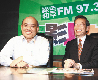 主持電臺節目的長謝長廷(右),昨天邀參選民進黨主席的蘇貞昌(左)接受訪問,兩人互動和樂。(圖片來源:臺灣《聯合報》)