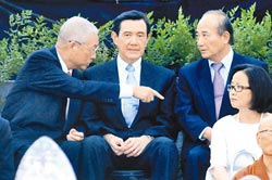 馬英九(右)、吳敦義(左)與王金平(右)13日出席慈濟浴佛典禮,3人在會中頻頻交談,馬英九表情始終嚴肅。(圖片來源:臺灣《中國時報》)