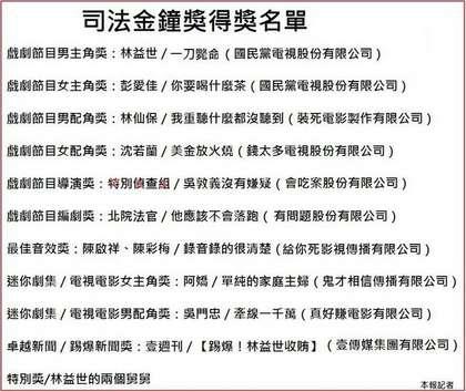 網友眼見這場好戲,立馬制作司法金鐘得獎名單,林益世以《一刀斃命》獲“戲劇節目男主角獎”,彭愛佳以《你要喝什么茶》獲最佳女主角,林仙保以《我重聽什么都沒聽到》獲最佳男配角,沈若蘭則以《美金放火燒》獲女配角獎。