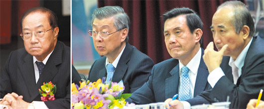 馬英九(右二)明天將邀臺(tái)“立法院長(zhǎng)”王金平(右一)、臺(tái)當(dāng)局“行政院長(zhǎng)”陳沖(右三)、臺(tái)“考試院長(zhǎng)”關(guān)中(左)研商勞工、軍人、公教人員退休年金的改革方案,會(huì)后將一起舉行記者會(huì),向臺(tái)灣民眾說(shuō)明這個(gè)重大政策。