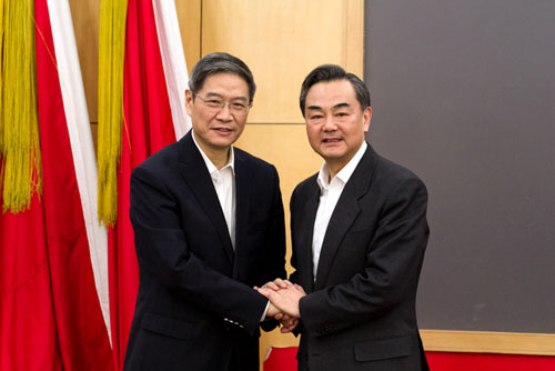 王毅(右)和張志軍(左)握手。