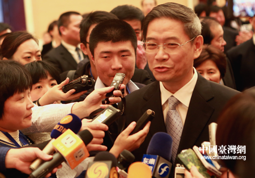 中共中央臺(tái)辦、國(guó)務(wù)院臺(tái)辦主任張志軍今日在第十一屆兩岸關(guān)系研討會(huì)開幕式后接受兩岸記者聯(lián)合采訪。(中國(guó)臺(tái)灣網(wǎng) 高斯斯 攝)