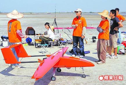 臺灣成功大學(xué)無人飛機(jī)“黑面琵鷺號”,昨在臺南縣七股鄉(xiāng)海邊空地上準(zhǔn)備升空。來源:臺灣《蘋果日報(bào)》