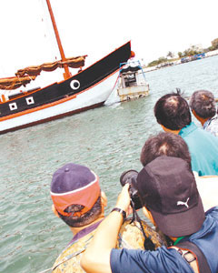 仿鄭成功時期戰船打造的“臺灣船”昨天在臺南市安平港下水,市民搶著拍照,見證歷史一刻。圖片來源:臺灣《聯合報》