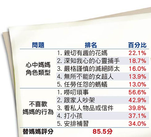 中國臺灣網(wǎng)5月4日消息 據(jù)臺灣《蘋果日報(bào)》報(bào)道,母親節(jié)前夕,一項(xiàng)針對臺灣高雄市中小學(xué)生對母親印象的調(diào)查顯示,媽媽在孩子心中得到85.5分的高分;22%的小朋友認(rèn)為自己的媽媽像卡通《我們這一家》中親切有趣的“花媽”,卻也有16%的學(xué)童認(rèn)為媽媽像金庸作品《倚天屠龍記》中的“滅絕師太”。而最討厭媽媽的行為為嘮叨、查看私人信件與干涉交友。