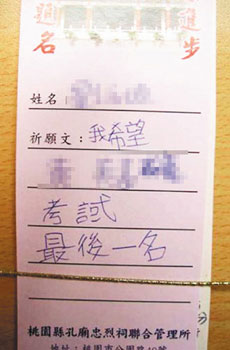 據(jù)臺(tái)灣《聯(lián)合報(bào)》報(bào)道,日前,島內(nèi)網(wǎng)絡(luò)電子郵件流傳一張?zhí)覉@縣孔廟的智慧祈愿卡,稚氣筆跡寫“我希望黃某某考試最后一名”,不但對(duì)方名字重寫3次才寫對(duì),考試的“試”也寫錯(cuò),疑似小學(xué)女學(xué)童的“妙文”在網(wǎng)絡(luò)上流傳。