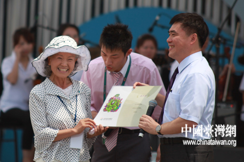 16日上午,臺(tái)北市長(zhǎng)郝龍斌在上海世博園城市廣場(chǎng)邀請(qǐng)“世博奶奶”山田外美代成為“花博奶奶”。當(dāng)天上午,“臺(tái)北印象·文化饗宴”演出活動(dòng)在城市廣場(chǎng)舉行。(中國(guó)臺(tái)灣網(wǎng) 田云鵬 攝)