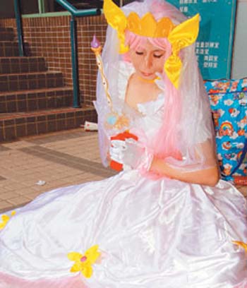 男生“斗天使”說,他中學時就喜愛“美少女戰士”,但當時沒cosplay文化,想都沒想過能扮成喜愛角色;聽說cosplay后,他從變身系美少女開始,一直扮到神職系(巫女、修女等),這次則選擇扮演“結婚桃子”。