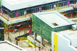 整個項目由10個兩層樓高的體塊項目組成(目前建成的有8幢)。每個體塊有七八千平方米左右,用不同色彩穿插識別,建筑群空間靈活多變,環境豐富多元。