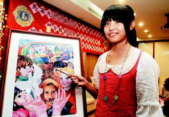 據(jù)臺灣《聯(lián)合報》報道,臺中市五權(quán)初中三年級學(xué)生陳郁旻,參加2009到2010年度聯(lián)合國和國際獅子會合辦的國際和平海報創(chuàng)作比賽,擊敗35萬名參賽者,勇得世界第一。