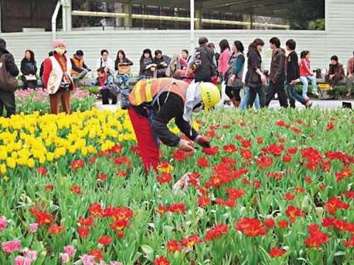 昨晚10時花博閉園后,花博營運總部派出80名工作人員,將圓山園區輕食區旁的特展區,換上18000多株郁金香,盡管特展區占地僅735平方米,但每平方米種植25株郁金香的密度,仍顯得相當美麗。