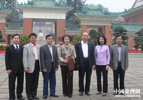 中山市副市長韓澤生(右二)、中山市政府副秘書長鄭向榮(左一)、中山市臺務局局長黃全歡(右一)等陪同林澄枝女士、謝孟雄先生等參觀中山紀念中學時合影(圖片來源:中山市臺辦)