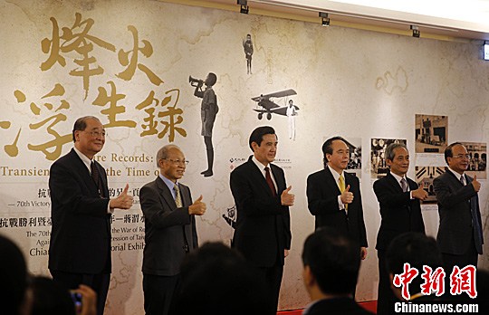 資料圖:抗戰勝利暨臺灣光復70周年,兩場紀念展7月臺北啟幕。臺當局領導人馬英九(左3)出席開幕式。(中新社發 鄭巧 攝 )