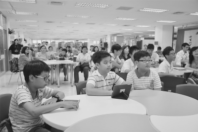 臺北小學生及家長在認真學習如何運用“酷課云”制作電子書。