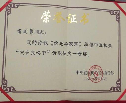由商成勇創作的《信念梁家河》日前獲得中直機關“黨在我心中”詩歌征文一等獎。在收到獲獎證書后,他激動地說:“這個分量很重的證書,說明謳歌時代、謳歌黨、謳歌我們黨的干部在艱難困苦環境中堅定信念,帶領群眾努力脫貧的奮斗精神受到肯定。同時,主旋律與正能量作品永遠有市場和受眾。”