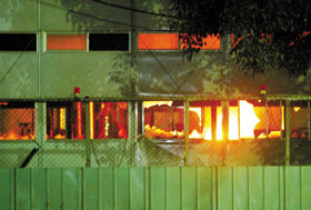 據(jù)了解,暴動(dòng)外勞至少燒毀廠區(qū)一棟工寮,工寮為連棟式建筑,分隔成30多間房子,另放火燒毀一間車棚及多輛車子。暴動(dòng)外勞并持彈弓攻擊路人及警方。
