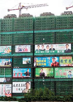 “三合一”選戰已進入倒數時刻,屬于超級戰區之一的臺北縣選情緊繃,板橋市一棟正在建造的大樓,成為各候選人兵家必爭之地,掛滿巨型競選布條,格外顯眼。(臺灣聯合報圖)
