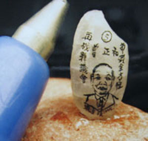 中新網11月30日電 據臺灣媒體報道,臺北縣新店毫芒雕刻家陳逢顯在一粒米上刻了全球最小競選文宣,為新店區國民黨縣“議員”候選人曾正和助選,米粒上有曾正和的像、競選號碼5號、“市政全方位、再戰縣議會”字樣與陳逢顯的落款。