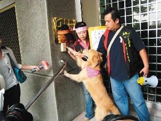 臺灣愛狗族昨天到板橋地檢署提出告發(fā),連小狗也一起按鈴,希望檢方盡速查明這起剝皮虐狗案。(圖:聯合報)