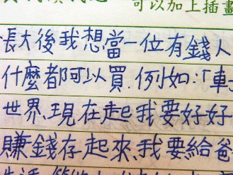 黃姓婦人長子在周記上寫著:長大后想當有錢人。